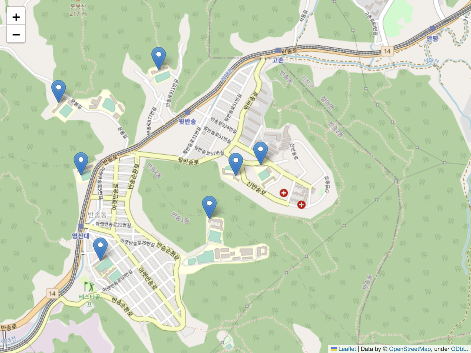 지도의 모습을 통해 반송동 아파트 위치와 밀집도를 알 수 있습니다.